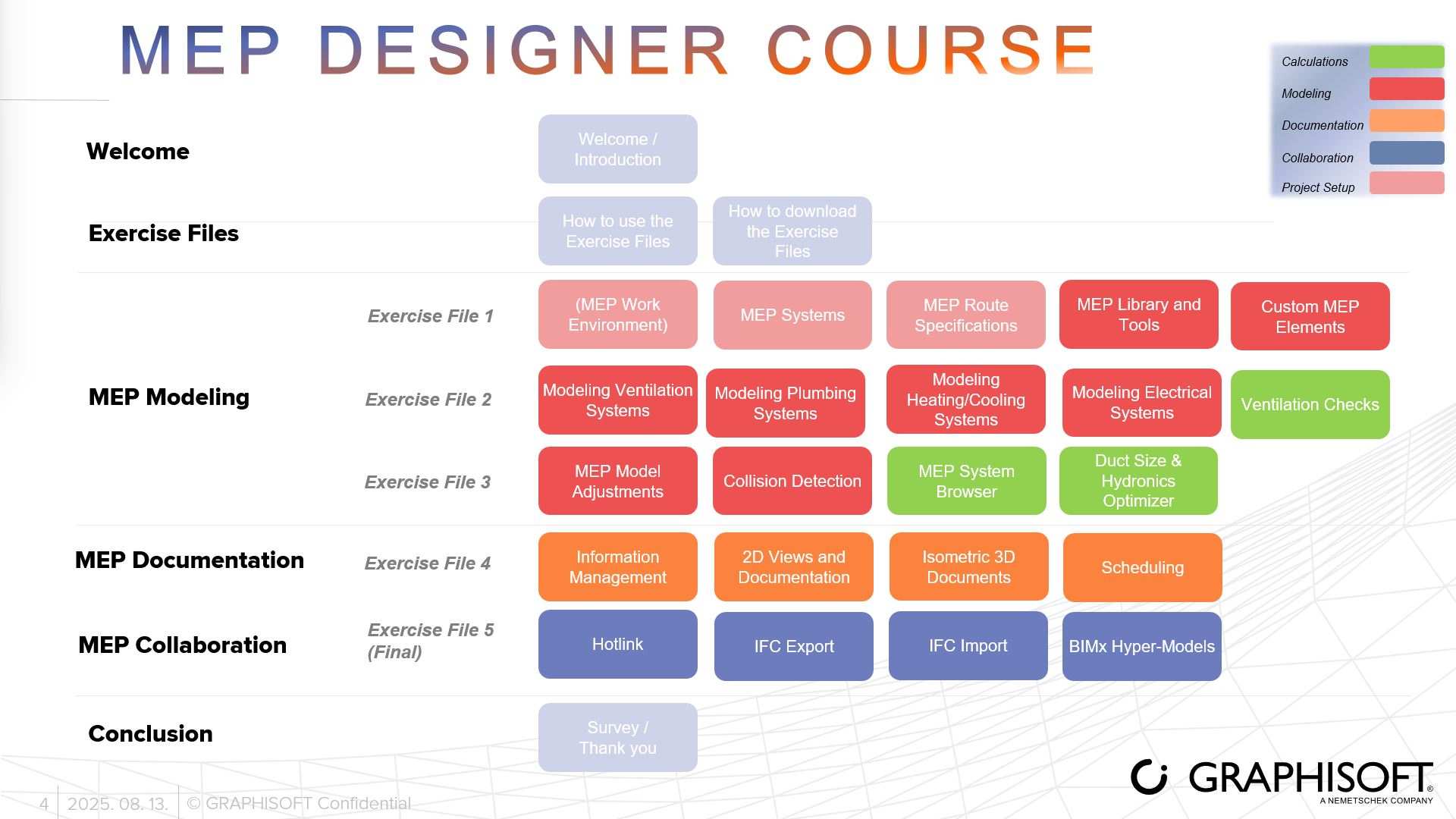 MEP DocumentationThis module guides you through the steps to follow after completing a 3D model. It emphasizes the model's role in acquiring valuable and accurate information swiftly. The content covers everything from managing properties to exploring different documentation and model output techniques. |